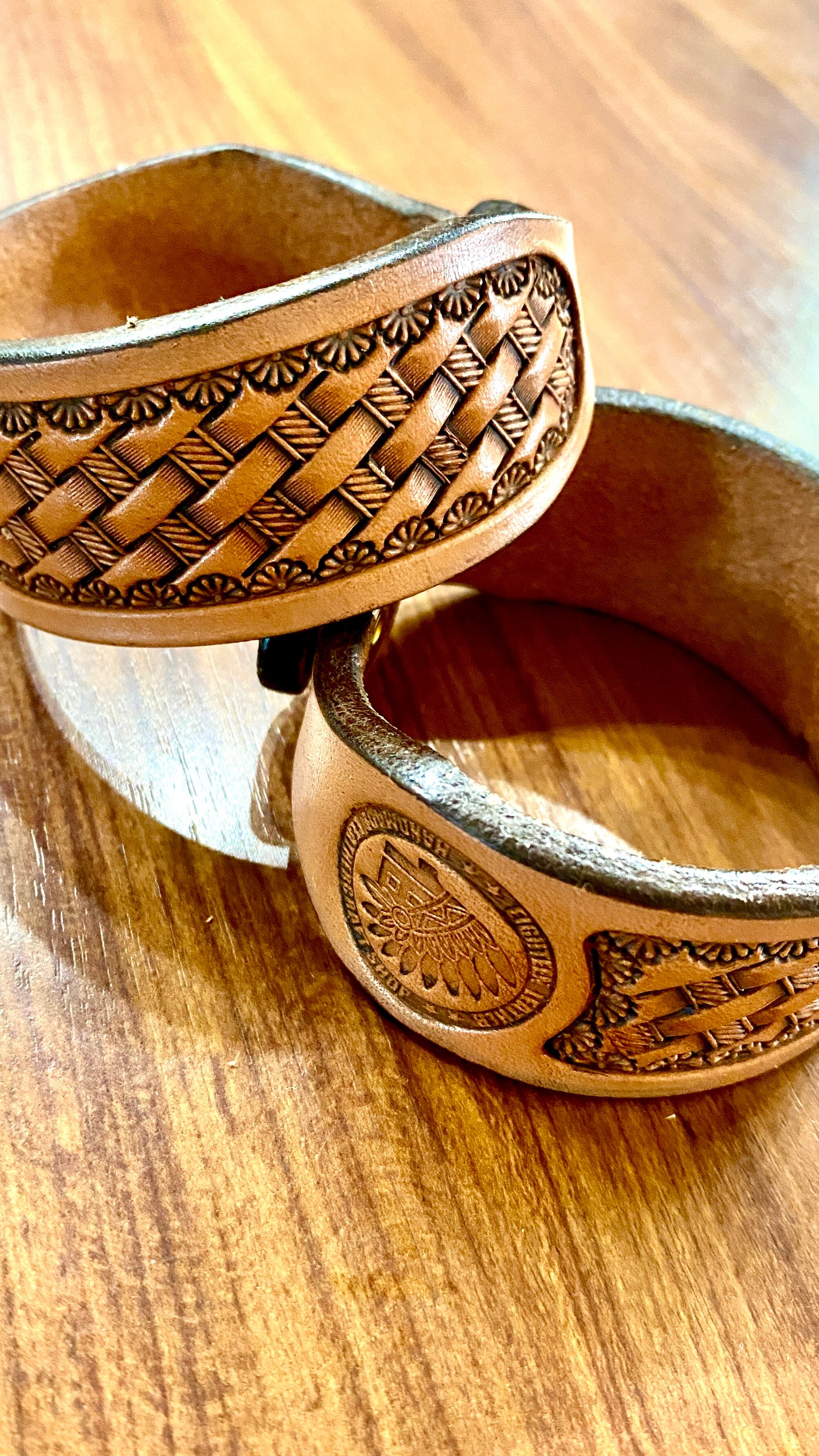 厚みのあるヌメ革にバスケット刻印を打刻したこのバングルは、存在感抜群のアイテムです。手作業で仕上げられた独自のデザインは、シンプルながらもどこか特別な雰囲気を醸し出しています。厳選されたレザーを使用しているため、使い込むほどに味わい深い風合いが楽しめるのが最大の魅力です!