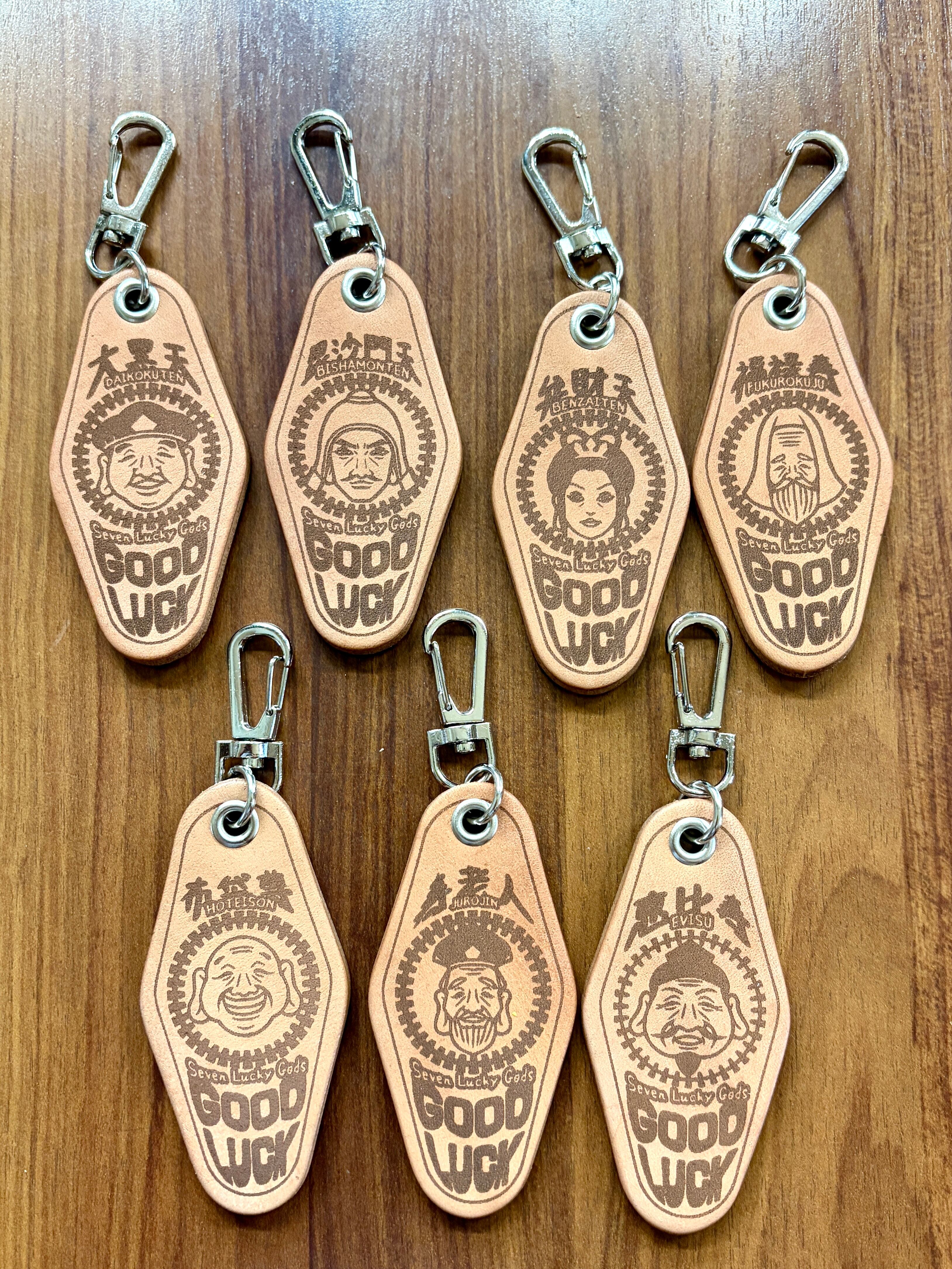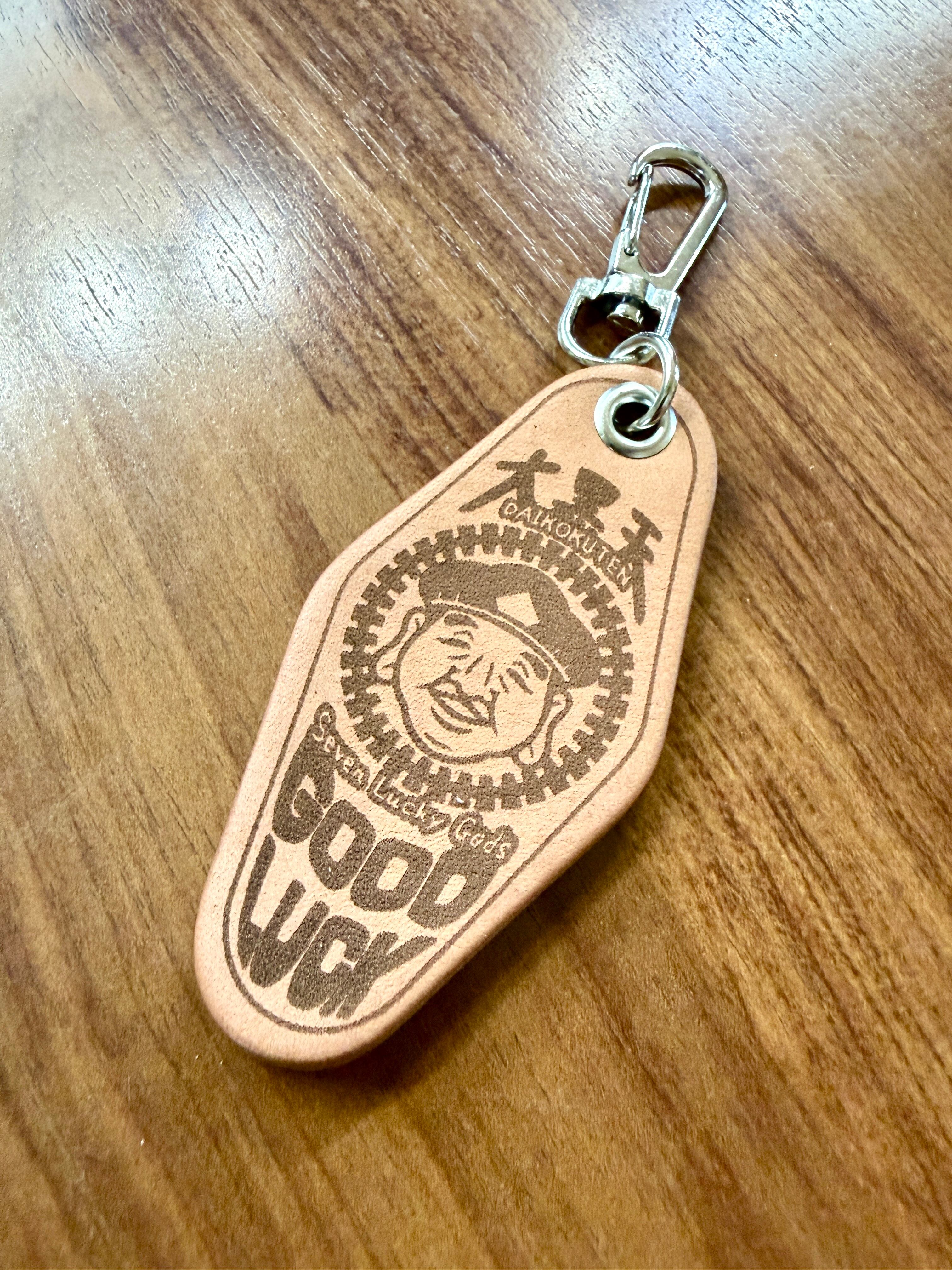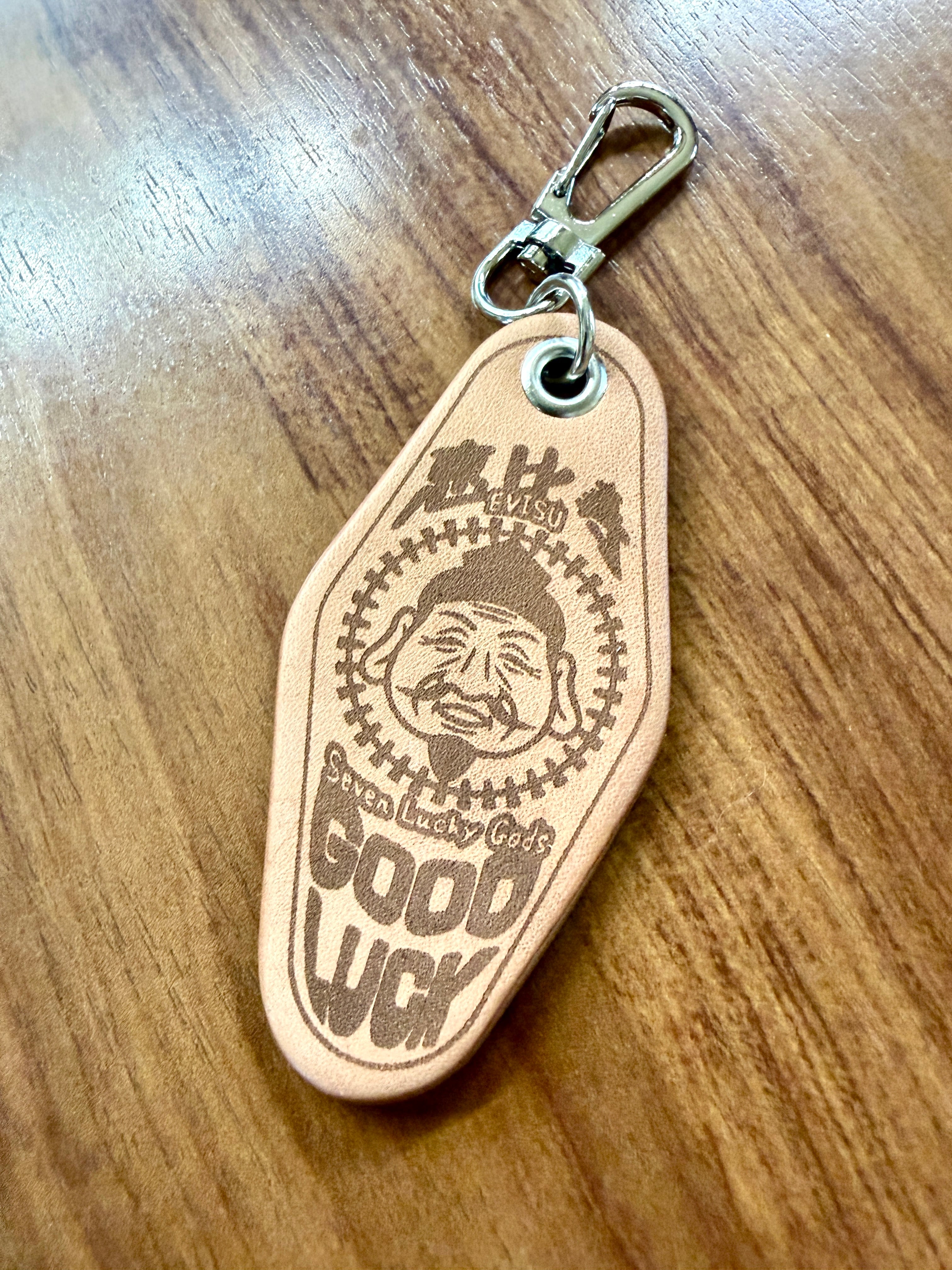 この七福神キーホルダーは、エイティーン・レザーオリジナルデザインによる七福神のレーザー彫刻が施されており、個性的な魅力を持つアイテムです。しっかりとした厚みのある丈夫なヌメ革を使用し、見た目だけでなく長持ちする耐久性も兼ね備えています。キーホルダーとしての機能性はもちろん、持つだけで気分が華やぎ、日常の生活に一層の楽しさをプラスします。